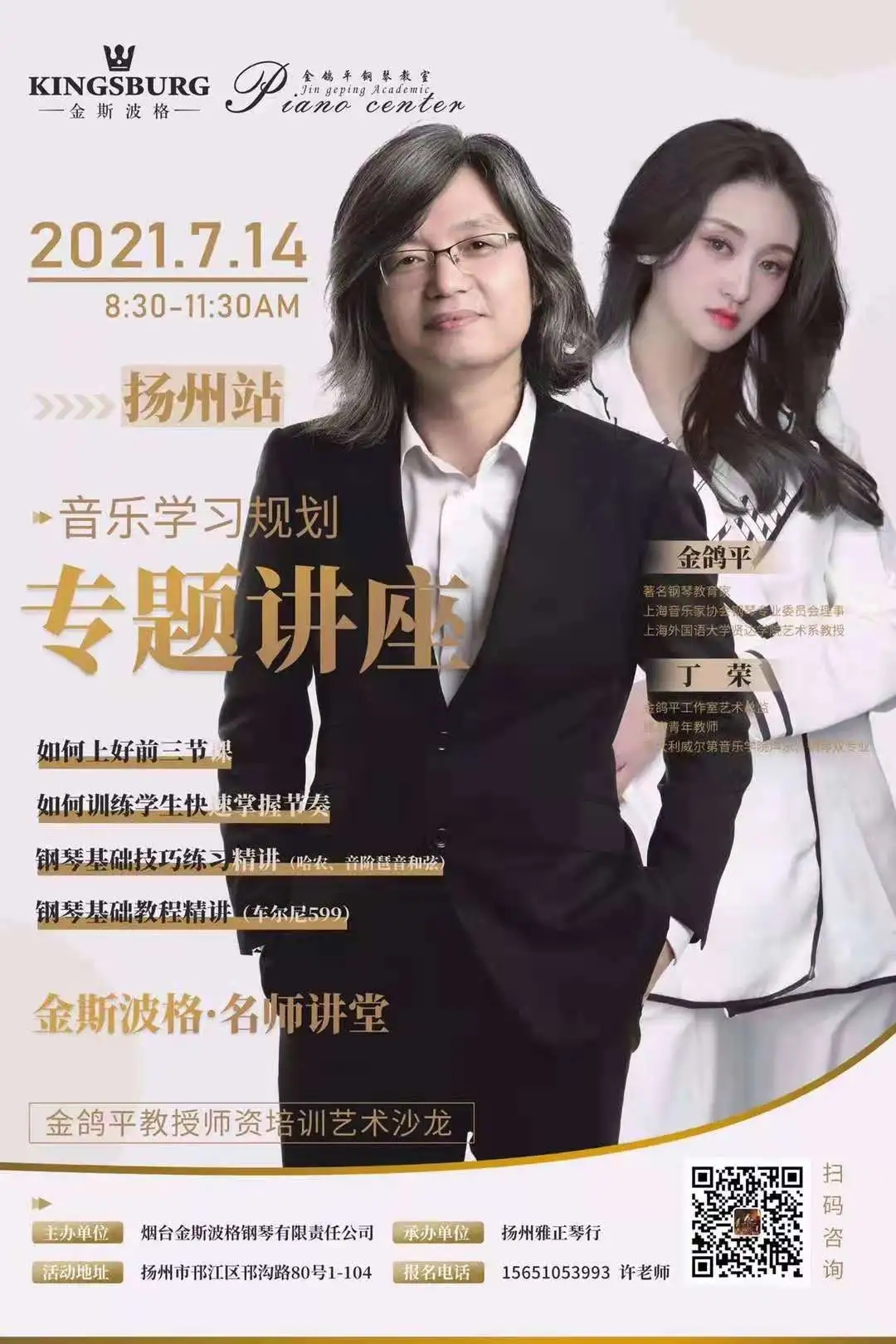2021-09-242021年7月14日,由金斯波格钢琴主办、扬州雅正琴行承办的金斯波格·名师讲堂第四站在“中国运河第一城”—扬州开讲,本次培训依旧邀请了金鸽平教授和青年教师丁荣老师进行现场亲临指导,为在场的钢琴老师分